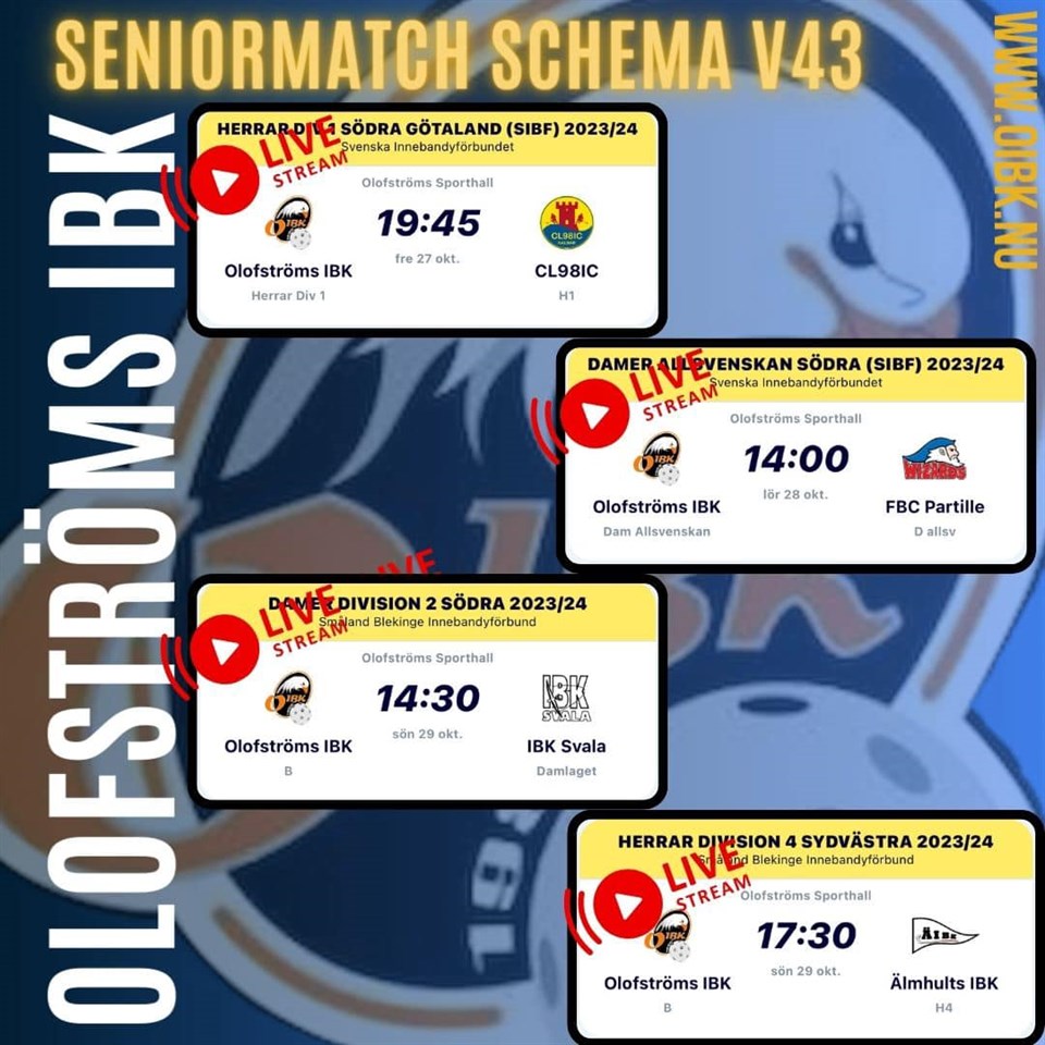 Samtliga seniorlag (Herr div.1, Dam Allsvenskan, Dam div.2 och Herr div.4) har hemma matcher under fredag, lördag och söndag v.43. Kom till Sporthallen och heja på våra lag! Olofströms IBK 25 okt 2023 0kommentarer